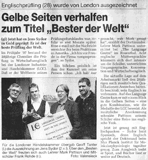 (gl) Jetzt hat es Jens Sydor in Gold geprägt: Er ist der beste Prüfling der Welt. Im Frühjahr '97 bestand der 28jährige Chemiker die Prüfung in Wirtschaftsenglisch bei der Londoner Industrie und Handelskammer (LCC). Daß er der Weltbeste seines Prüfungsdurchlaufes war, erfuhr er erst Monate später: Eine Email mit der Nachricht erreichte ihm beim Praktikum in Amerika. "Ich bin vor Freude in der Firma rumgesprungen", so Sydor. Ein bißchen peinlich ist ihm der Rummel um seine Person schon. "Ich hab' nur gemacht, was der Mark gesagt hat", erzählt der Dortmunder. Lehrer Mark Pattison unterrichtet bei "The Language Centre" im Rosental. Acht englische Muttersprachler kümmern sich dort intensiv um die Schüler, unterrichten Umgangssprache, Konversation und Wirtschaftsenglisch. Die aktuelle Lage auf dem Arbeitsmarkt ließ den 28jährige nach zusätzlichen Qualifikationen Ausschau halten. Er beschloß, sein Englisch zu verbessern. Auf das Language Centre kam er mit Blick in die Gelben Seiten - eine gute Kombination, wie die Medaille der LCC beweist. Als zusätzliche Anerkennung schenkte Pattison seinem Schüler eine Reise ins englische York. Jetzt ist genug mit Englischpauken - Sydor lernt Spanisch, denn Englisch spricht der Doktorand beim Max Planck Institut für Molekularphysiologie tagsüber genug. Zum Ausgleich treibt er Sport, und Bücher liest er weiter auf Deutsch. Für die Londoner Handelskammer übergab Geoff Tranter (l.) die Auszeichnung an Jens Sydor (2.v.l.) Über den "Besten der Welt" freuten sich auch Lehrer Mark Pattison und Mitschüler Frank Rohde (r.) Foto: Valensieck |